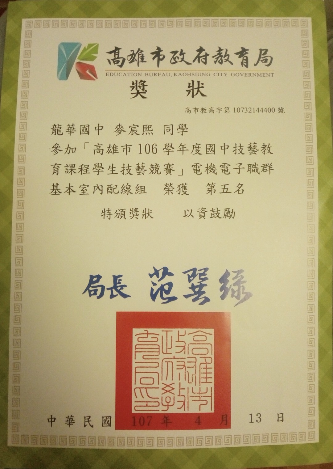 榮獲高雄市電機電子職群-基本室內配線組 高市第五名