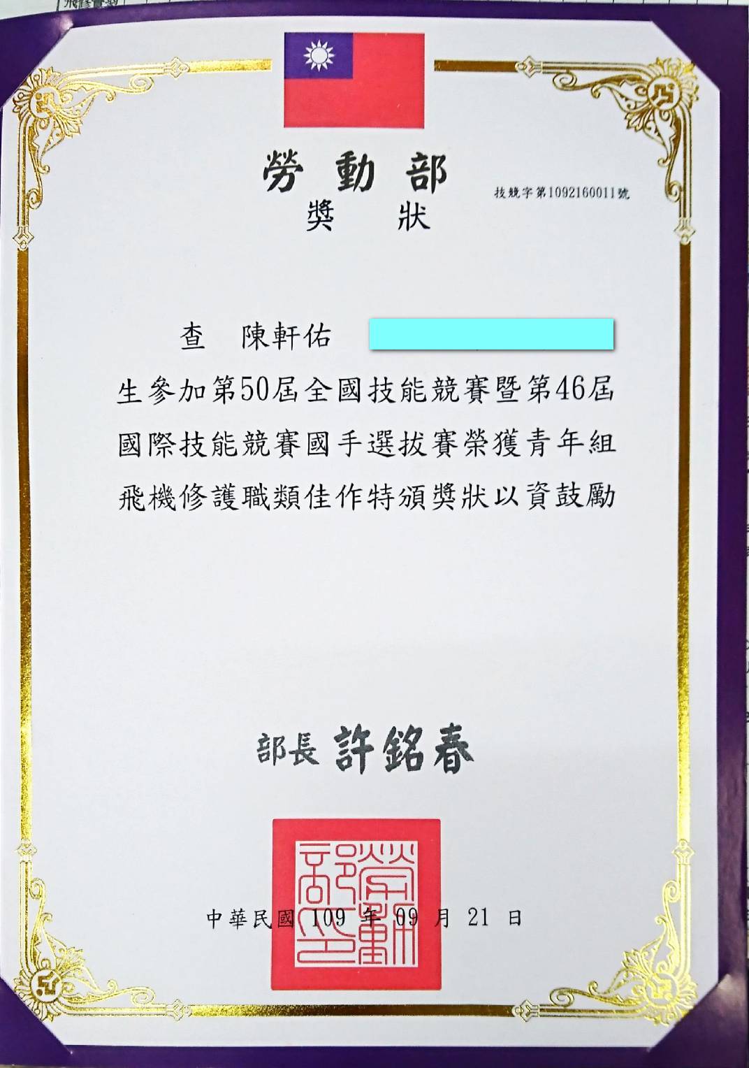 恭賀. 本校飛修科榮獲勞動部舉辦2020第50屆全國技能競賽-第六名佳作。