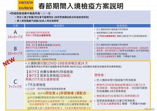 二、農曆春節為中國傳統之重大節日,春節返鄉人潮眾多,為讓國人能盡快返鄉並因應防疫旅館量能不足,自本(2021)年12月14日至明(2022)年2月14日期間,檢疫方式除原有之方案A(14+0)外,另增加方案B(10+4)及方案C(7+7),惟近期國外因新型Omicron病毒株肆虐,染疫人數攀升,為落實本市防疫檢疫措施,保全社區安全,避免境外病毒於社區傳播。