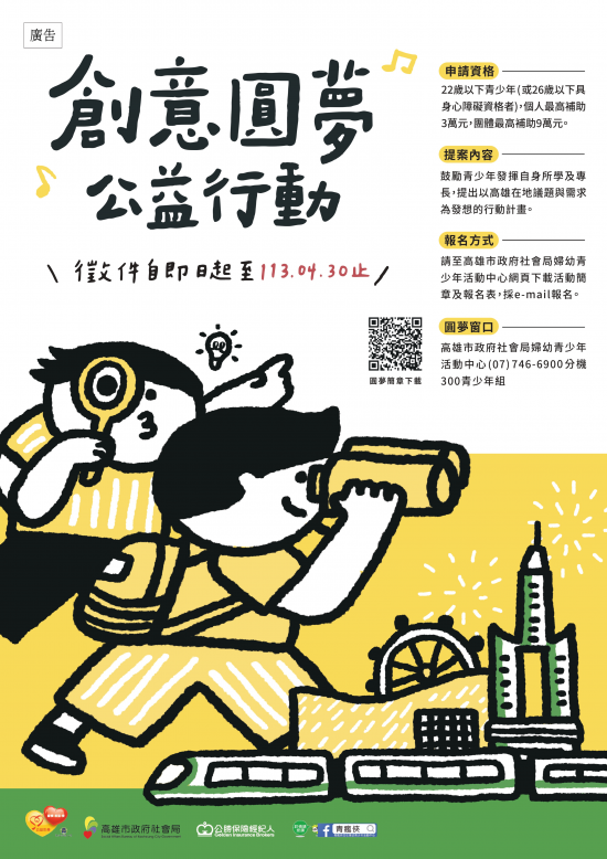 一、為鼓勵青少年發揮創意、結合公益組織規劃服務行動方案,透過回饋社會的行動,讓青少年能量與社會接軌,創造青少年的正向自我價值,故辦理「創意圓夢‧公益行動」計畫。活動徵件自即日起至113年4月30日(星期二)止,開放22歲以下青少年(或26歲以下身心障礙者)個人或組隊報名,提出以高雄在地議題或社區需求為發想之行動方案,經審查核准後可補助個人最高3萬元、團體最高9萬元。