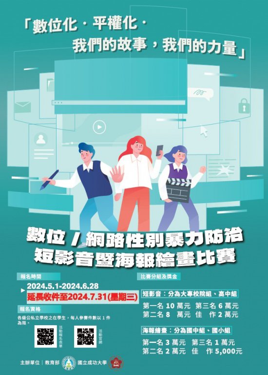 (一)活動主題:得參考行政院函頒「數位/網路性別暴力之定義、類型及其內涵說明」(下載網址:https://reurl.cc/13D1MQ),創作10種數位/網路性別暴力態樣之短影音(大專校院組及高中職組)及海報繪畫(國中組及國小組)作品。