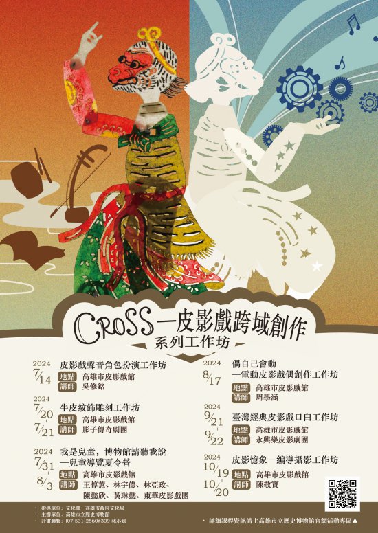二、高雄市立歷史博物館於今(113)年假高雄市皮影戲館及捷運岡山高醫站推出《回·聲-皮影戲的跨域藝術》及《岡好》2檔跨域藝術特展,邀請陳敬寶、吳修銘及周學涵三位藝術家以皮影戲為主題進行藝術創作。為使大眾更加了解皮影戲的跨界藝術,將於7至10月辦理「CROSS─皮影戲跨域創作系列工作坊」,期盼以嶄新的風貌翻轉對皮影戲的印象,鼓勵大眾親近在地文化。