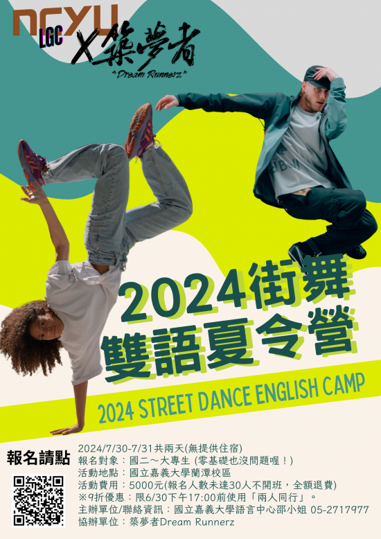 一、「2024年巴黎奧運」正式將街舞中之霹靂舞列為比賽項目,街舞躍上奧運舞台,從街頭文化正式登上國際體壇。此街舞雙語夏令營訴求結合活力四射之街頭舞蹈及英語學習(英語+動感),特別邀請街舞征戰經驗豐富且專業精湛之「築夢者」教師授課。