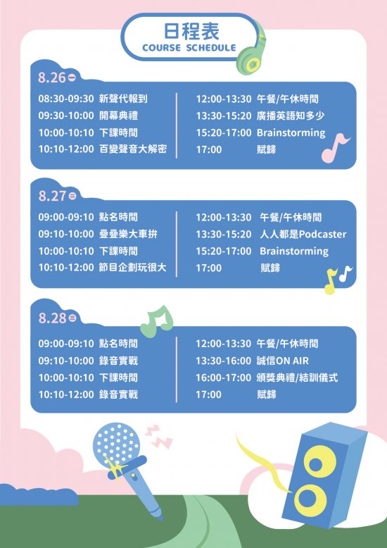 (三)工作坊內容:以時下流行的Podcast創作為主軸,將各項課程主題融入誠信內涵,讓高中(職)生親身參與企劃並製作聲音節目,使其在興趣與團隊合作的過程中,激發創意並深植誠信觀念,進而培養聲音節目製作專業知識及新媒體應用倫理。