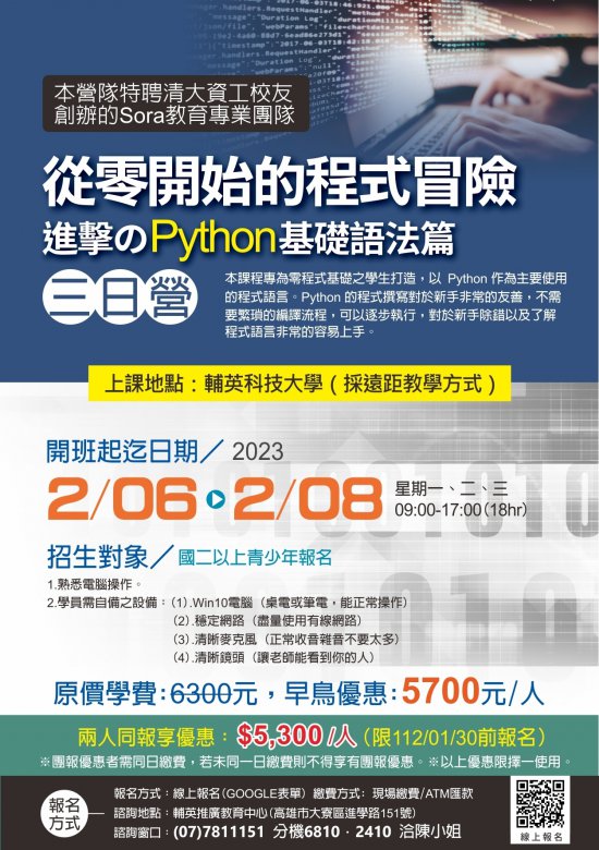 二、適合對象:國二以上青少年報名,熟悉電腦操作,學員需自備之設備:Win10電腦 (桌電或筆電,能正常操作)、穩定網路 (盡量使用有線網路)、清晰麥克風 (正常收音雜音不要太多)、清晰鏡頭 (讓老師能看到你的人)。