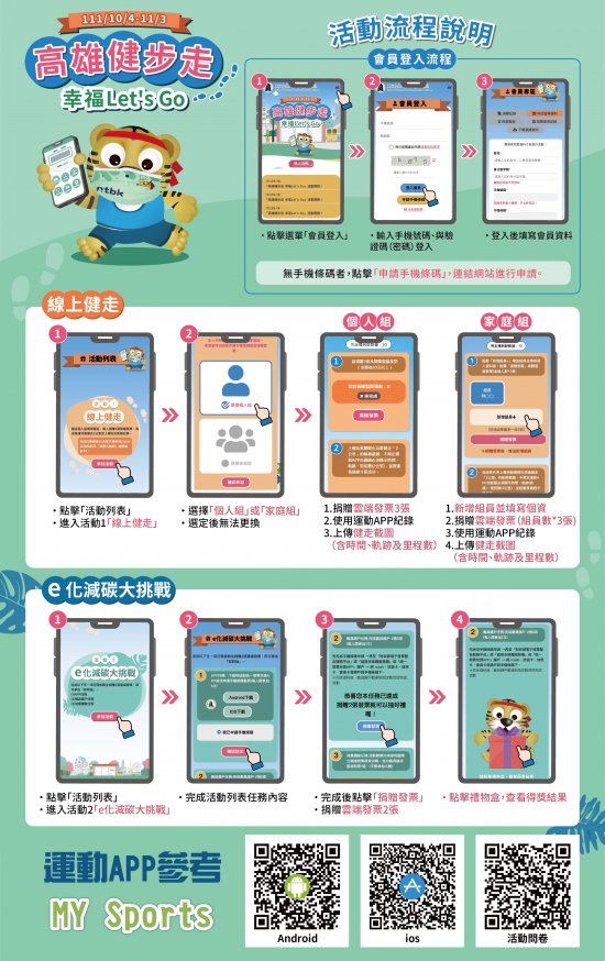 一、民眾報名參加旨揭活動並捐贈雲端發票3張,於高雄地區完成健走2公里並上傳完走軌跡紀錄,可獲得「雄讚大抽獎」機會,前3,000名完成者可獲50元超商禮券;另有雲端發票「e化減碳大挑戰」活動,完成任務即有機會抽中超商禮券。 二、活動詳情可至活動網站https://kh-ntbk.fastez.net/查詢,檢附旨揭活動DM電子檔供參。