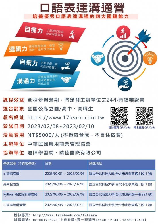 無論是升學口試或求職面談,口語表達已經是現代人不可或缺的能力。「口語表達溝通營」透過講解、示範、訓練和不斷的演練,克服公開發言的恐懼,人人都可以成為口語表達的高手!