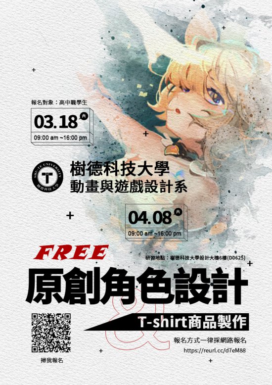 一、歡迎高中職對於角色與週邊商品設計有興趣的同學報名參加,相關研習課程如附件。 二、活動時間:112年3月18日(六)及112年4月8日(六),共計2場次,研習地點:樹德科技大學設計大樓6樓D0625教室。 三、報名方式:採網路報名(https://reurl.cc/d7eM88),研習課程全程免費並頒發研習證書及T-shirt一件。 四、錄取方式:以報名表單填寫完成之先後順序為錄取排序,每場次限定30名,錄取學員將另以E-mail及電話通知後續事宜。