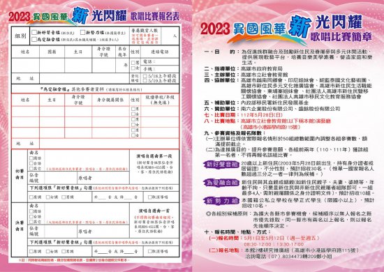 (三)新勢力組:國小以上在學正式學生,招收10名。本國籍演唱新南向國家語言歌曲或新二代演唱其父/母親之母國歌曲(如韓國新二代演唱韓語歌曲,其它國籍類推)。