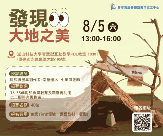 二、主辦機關:教育部青年發展署;承辦單位:青年發展署臺南青年志工中心(崑山科技大學)。