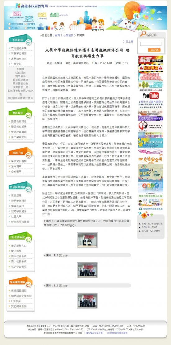 在南部地區航空維修人才培訓教育,首屈一指的大榮中學飛機修護科,繼與台南亞洲航空公司簽署產學合作後,再獲得華航子公司臺灣飛機維修公司的青睞,攜手策略聯盟科技大學產學合作,透過三方產學合作,札根技職教育發展新模式,規劃升學就業一條龍。