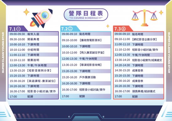 (二)營隊內容:從廉政誠信概念出發,將廉潔概念透過多元角度融入,以時下流行之短影音為媒介,產出雙語誠信短影音成果,使高中(職)生在團隊學習過程中發揮創造力。
