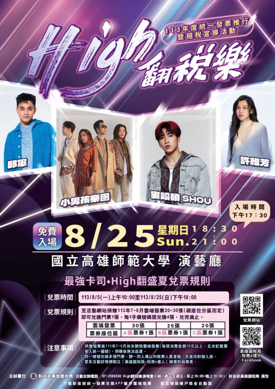 一、旨揭演唱會訂113年8月25日(星期日)晚上6時30分至9時,於高雄師範大學演藝廳2樓(地址:高雄市苓雅區和平一路116號)舉辦。 二、本活動採線上兌票,捐贈113年7-8月未開獎雲端發票(無書立統一編號且消費金額10元以上)20-30張(依座位區域不同),可於活動網站兌換入場券,兌時時間自即日起至113年8月25日晚上6時止。 三、檢附演唱會活動電子宣傳單1份供參。