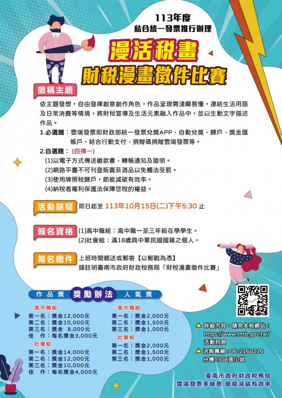 一、旨揭比賽除必選主題外,自選題請以本局設定之4個財稅主題擇一創作,作品呈現需淺顯易懂,連結生活用語及日常消費等情境,將財稅宣導及生活元素融入作品中,並以生動文字描述作品故事,本活動區分為高中職組及社會組,總金額高達15萬元以上,敬請協助周知以宏效益。 二、為鼓勵踴躍參與,入選作品將於本局臉書「稅樂園.好康報」粉絲專頁舉辦網路票選人氣獎活動,詳情請參閱本局網站https://www.tntb.gov.tw/公告資訊/活動訊息。 三、活動期間自即日起至113年10月15日止