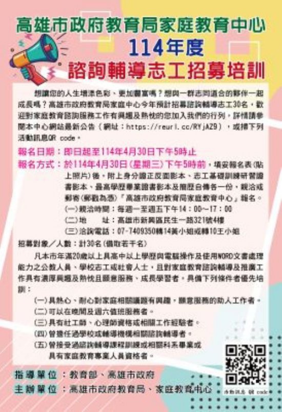 一、依據教育部114年3月13日臺教社(二)字第1142400688A號函辦理。 二、本中心辦理志工招募,鼓勵本市市民參與社會服務,協助推展本市家庭教育諮詢服務工作,即日起至4月30日(星期三)下午5時前受理報名。