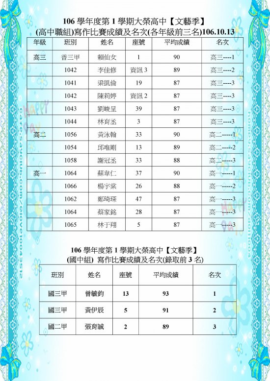 106學年度第1學期大榮高中【文藝季】寫作比賽得獎名單