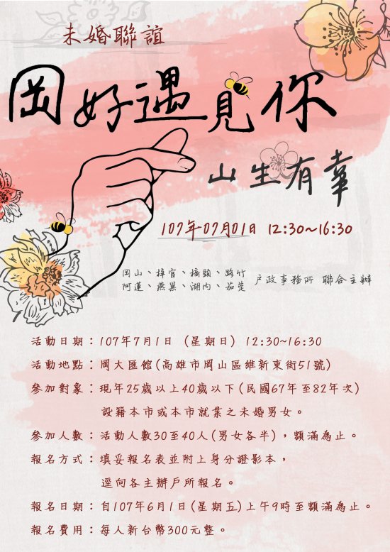 轉知107年「岡好遇見你~山生有幸」未婚聯誼活動計畫,詳如附件